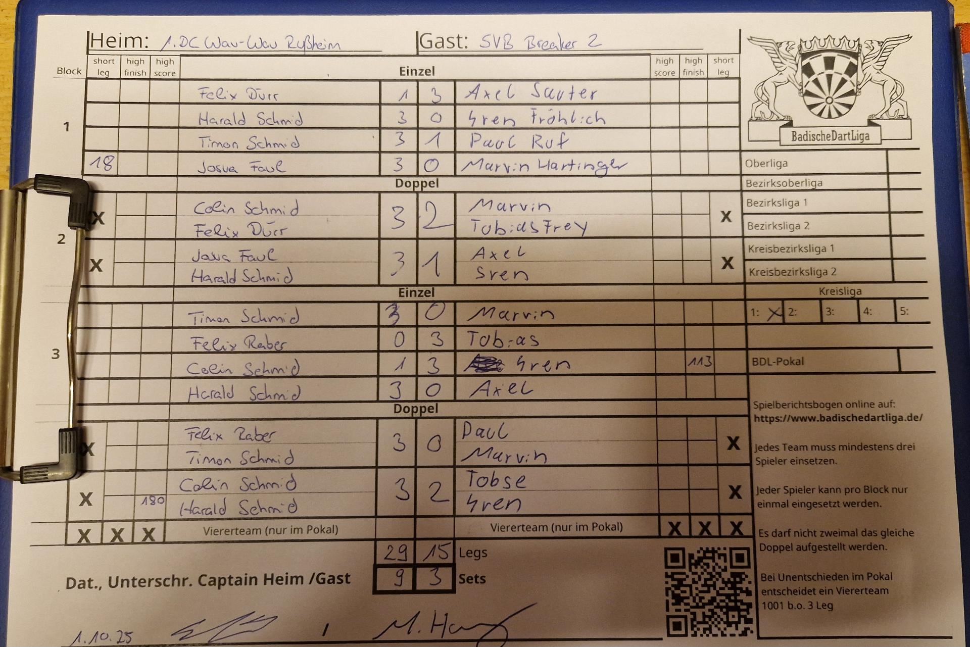 Ergebnis: | 29 : 15 | - Legs | ||||||