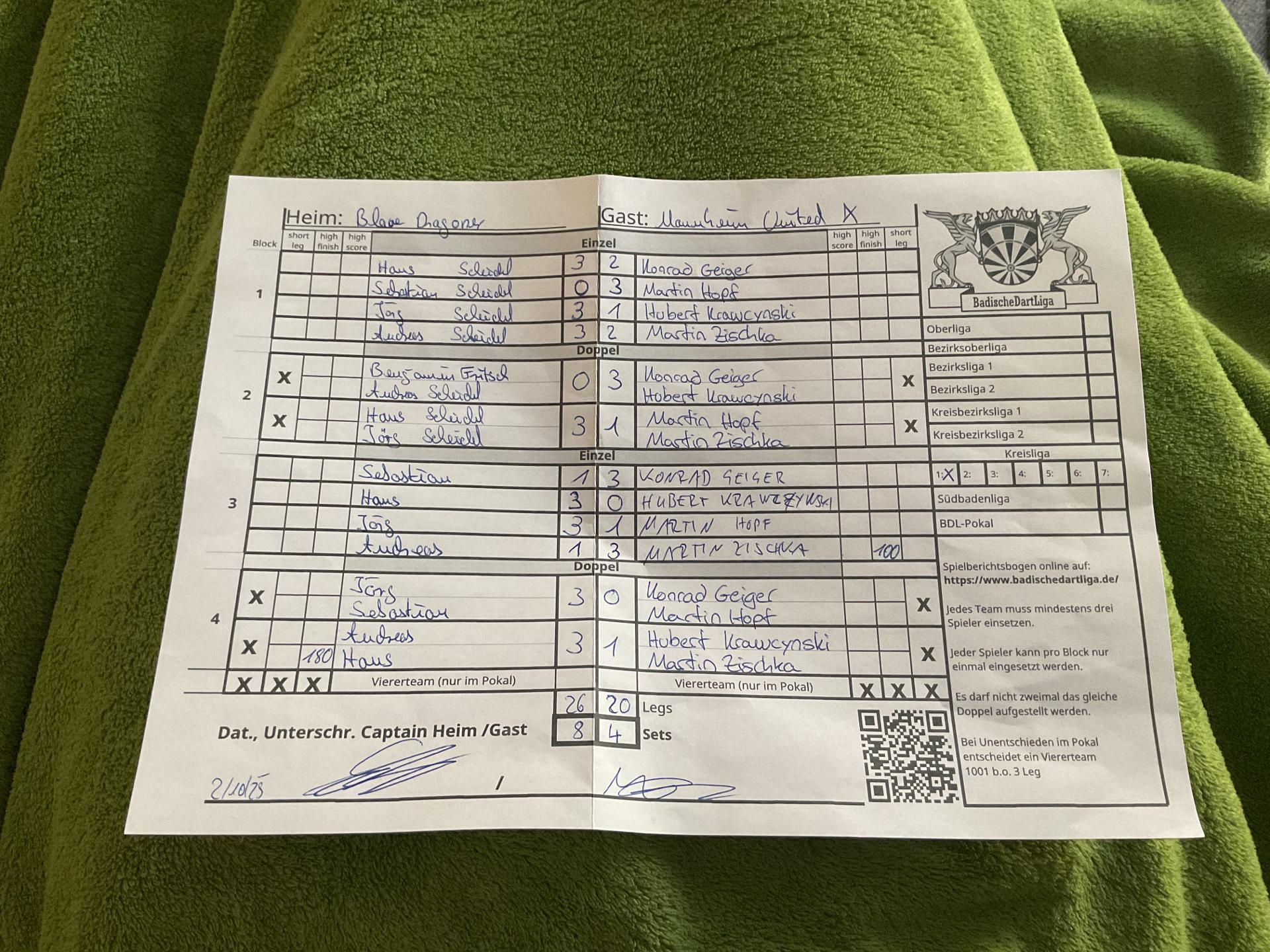 Ergebnis: | 26 : 20 | - Legs | ||||||