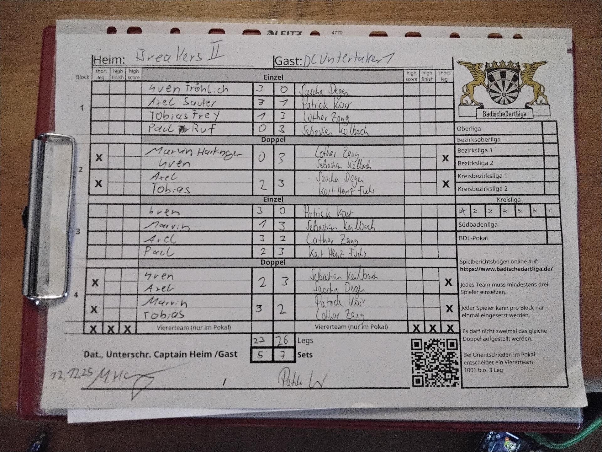 | Ergebnis: | 23 : 26 | - Legs | ||||||