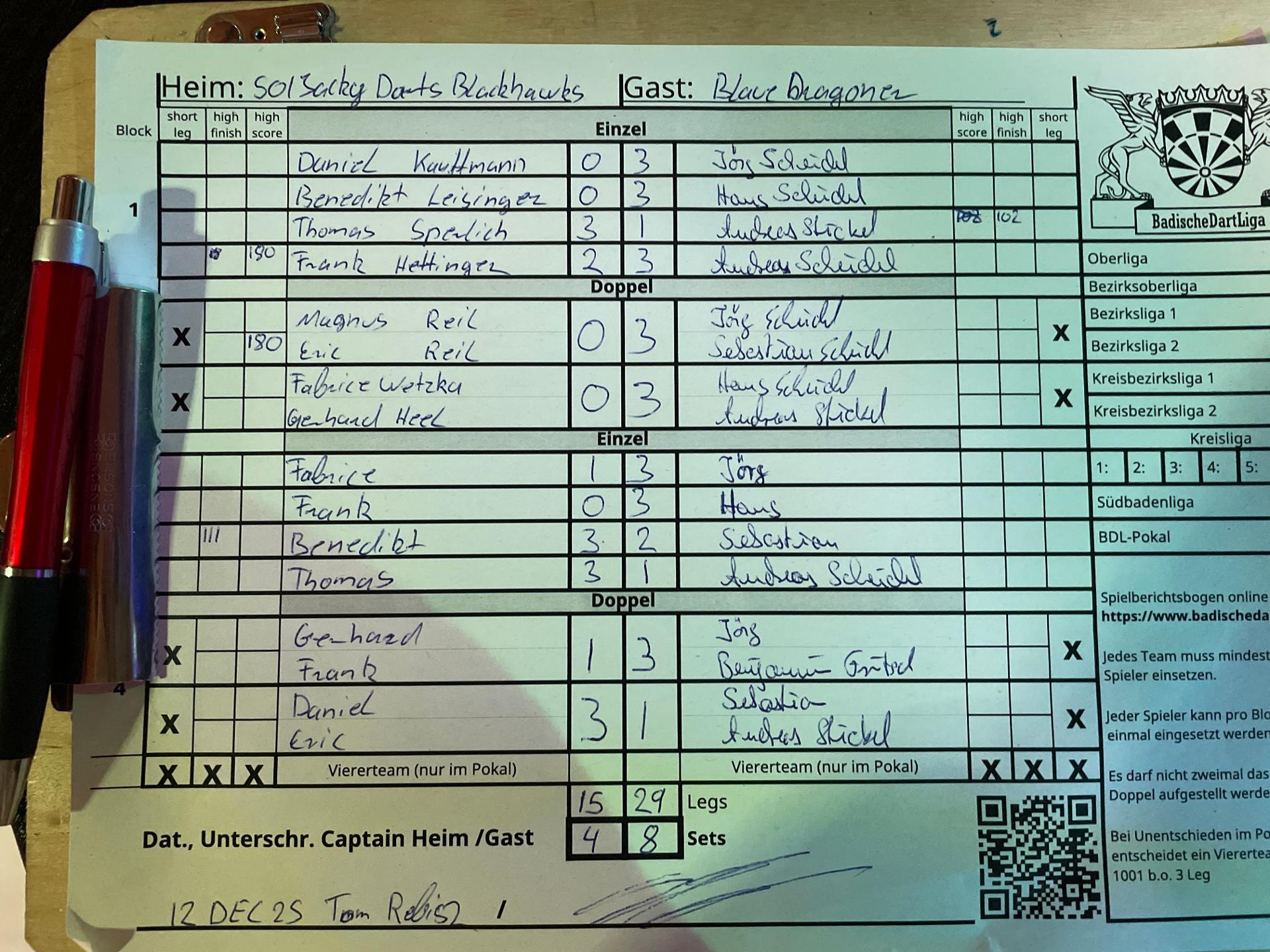 | Ergebnis: | 16 : 29 | - Legs | ||||||
