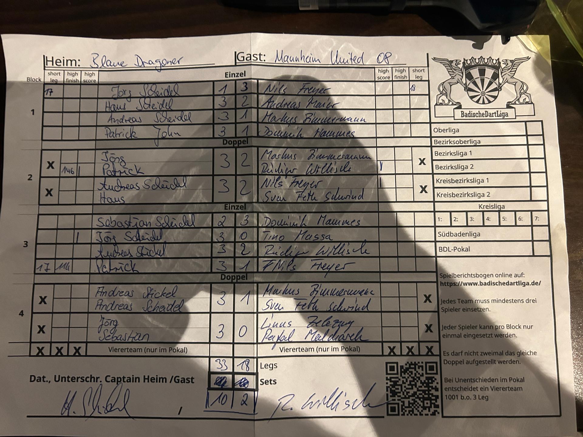 | Ergebnis: | 33 : 18 | - Legs | ||||||