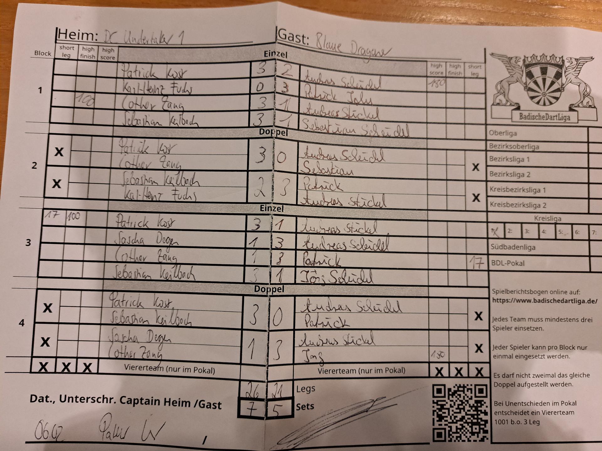 | Ergebnis: | 26 : 21 | - Legs | ||||||