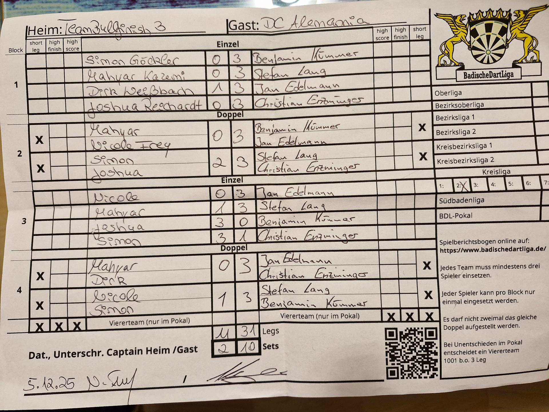 | Ergebnis: | 11 : 31 | - Legs | ||||||