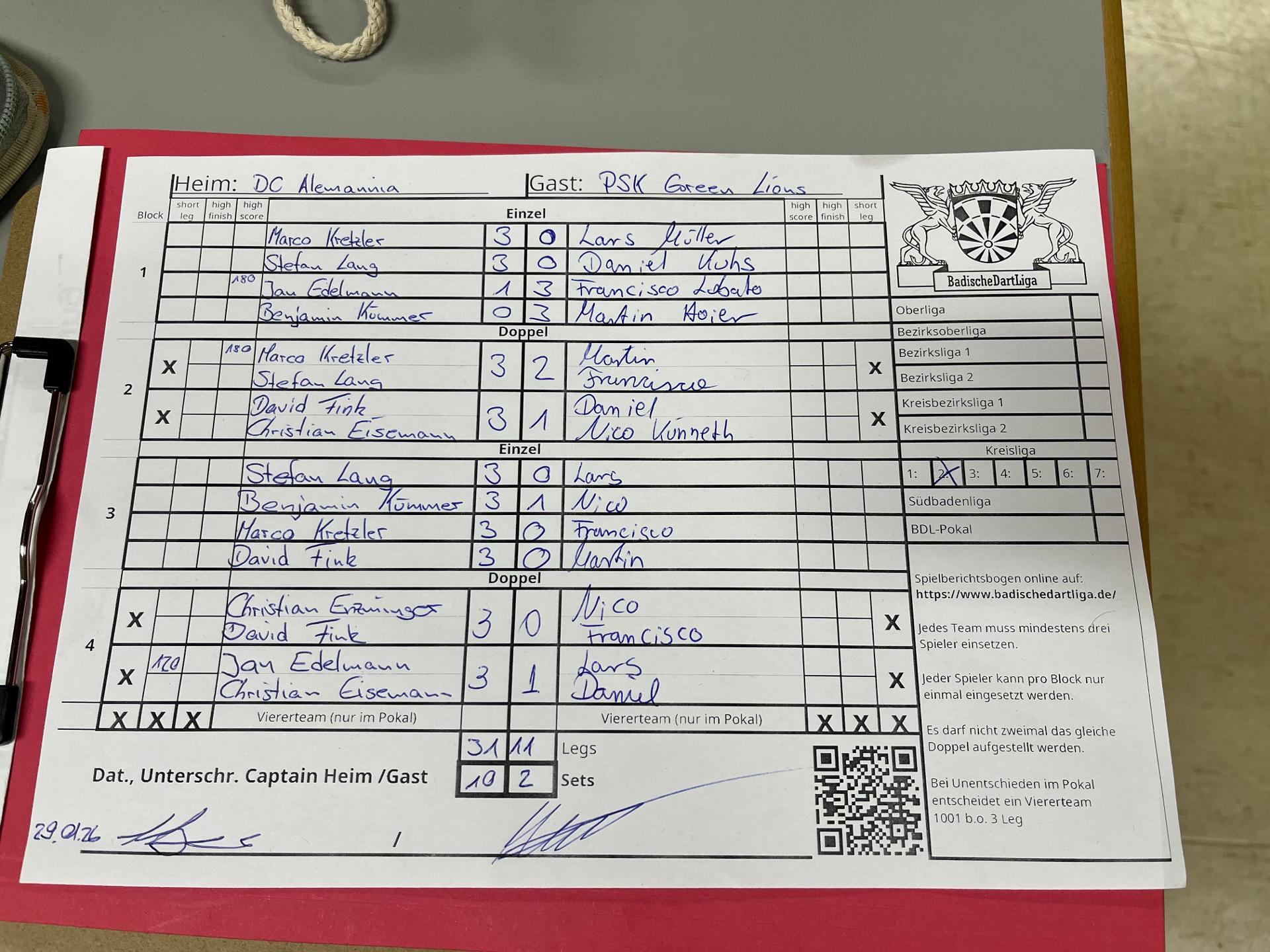 | Ergebnis: | 31 : 11 | - Legs | ||||||