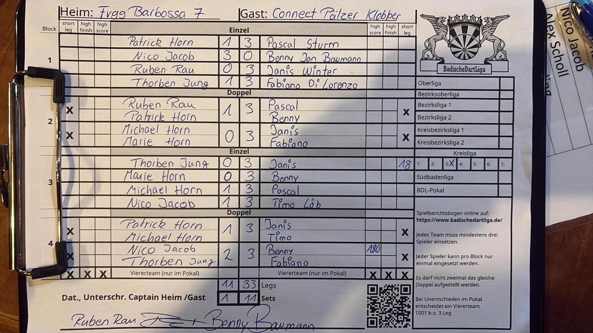 | Ergebnis: | 11 : 33 | - Legs | ||||||