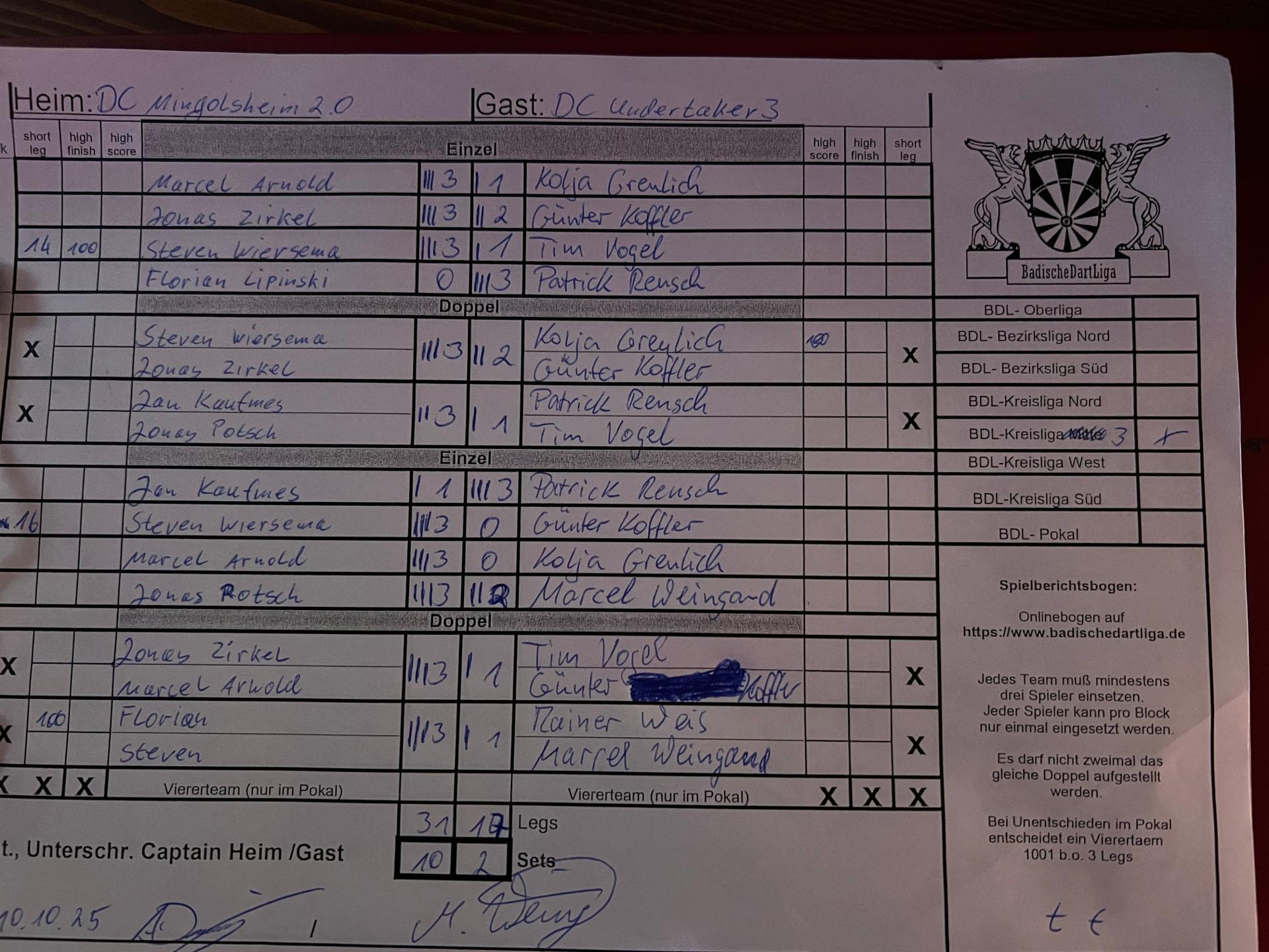 | Ergebnis: | 31 : 17 | - Legs | ||||||