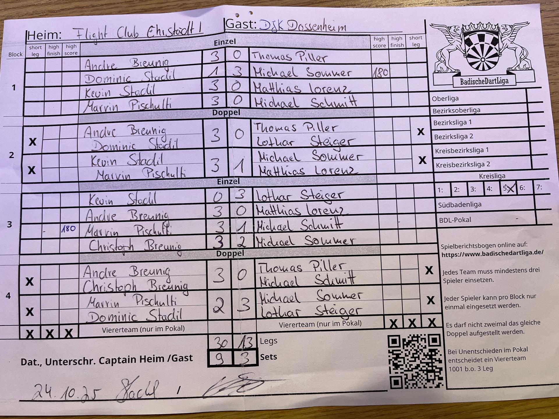| HEIM: | Flight Club SV Ehrstädt I | GAST: | DJK Dossenheim 1927 e. V. Steinbrecher Dart | |||||