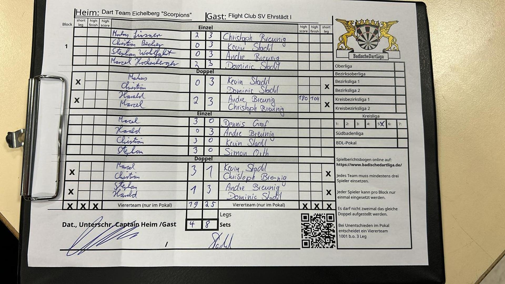 | HEIM: | Dart Team Eichelberg "Scorpions" | GAST: | Flight Club SV Ehrstädt I | |||||