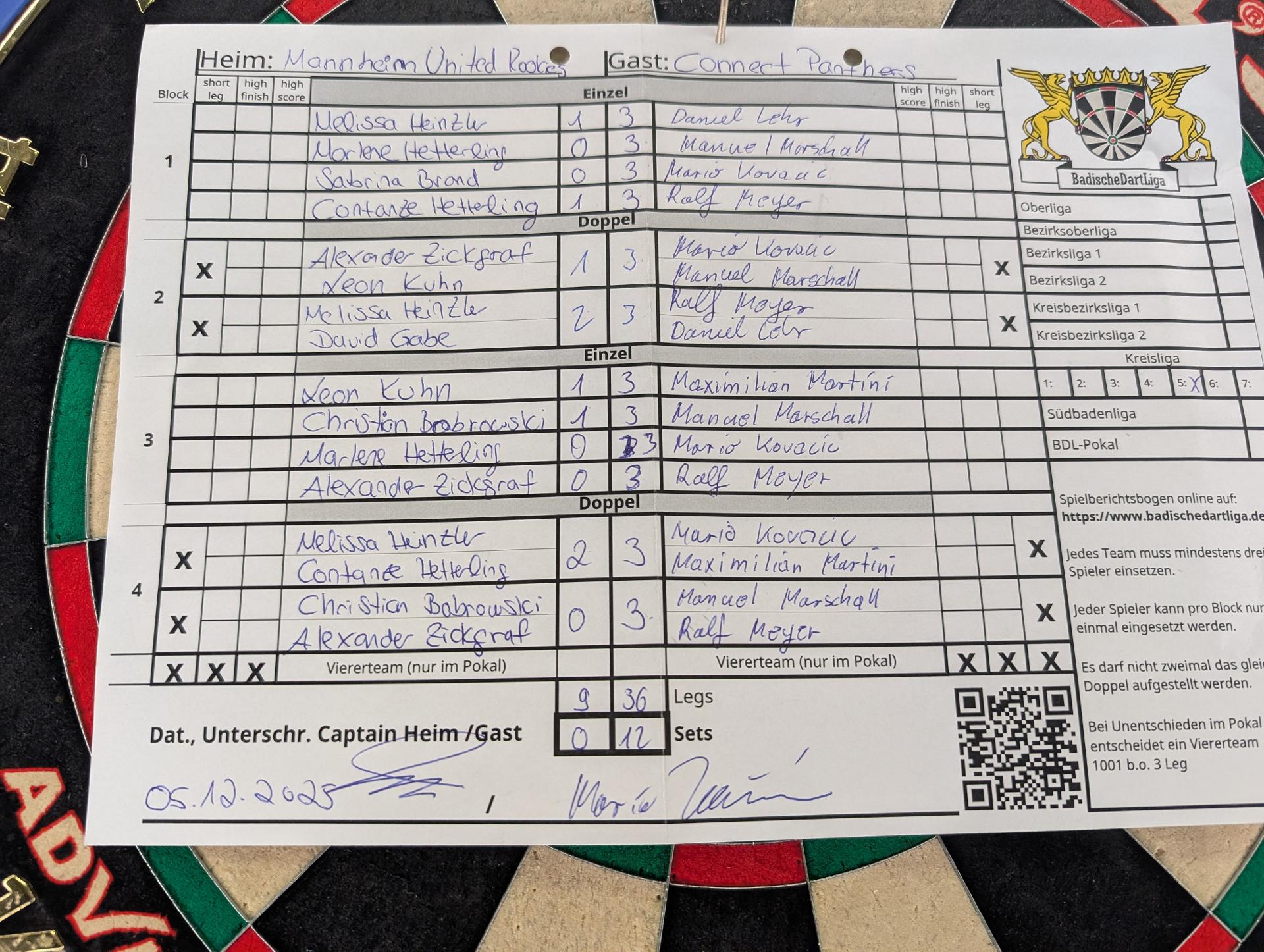 | Ergebnis: | 9 : 36 | - Legs | ||||||