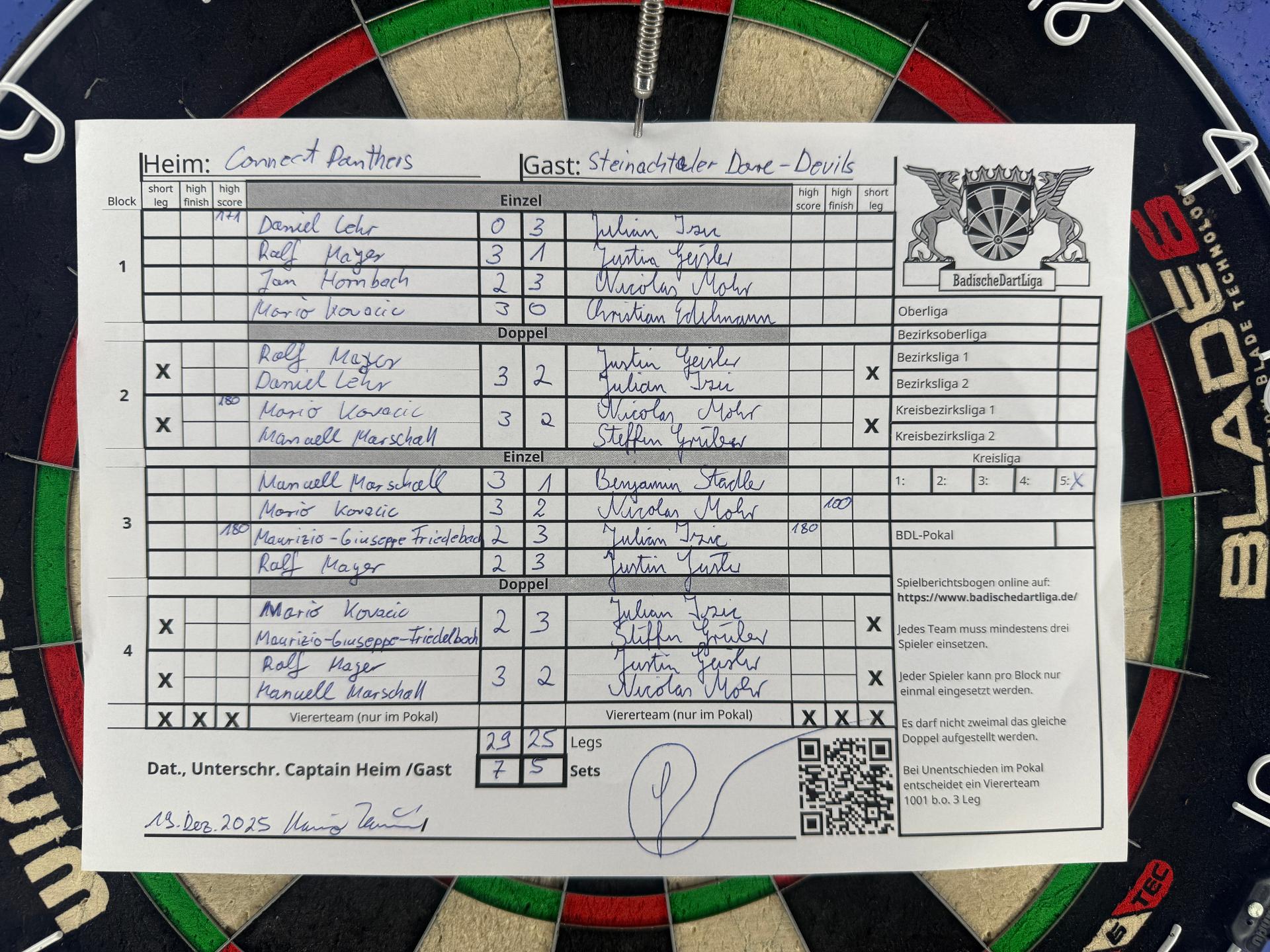 | Ergebnis: | 29 : 25 | - Legs | ||||||