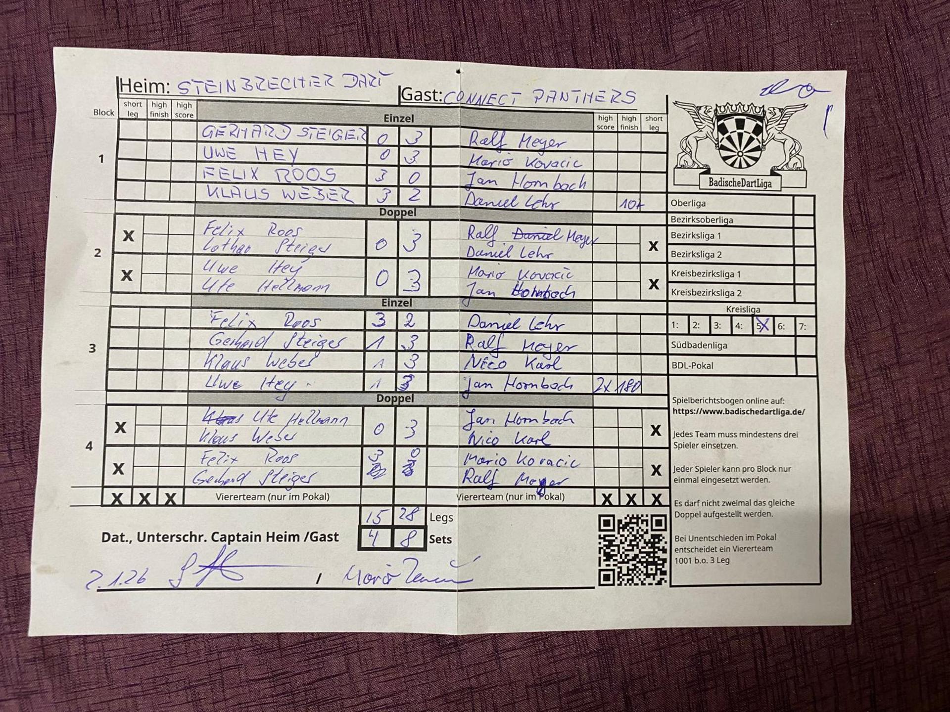 | Ergebnis: | 15 : 28 | - Legs | ||||||