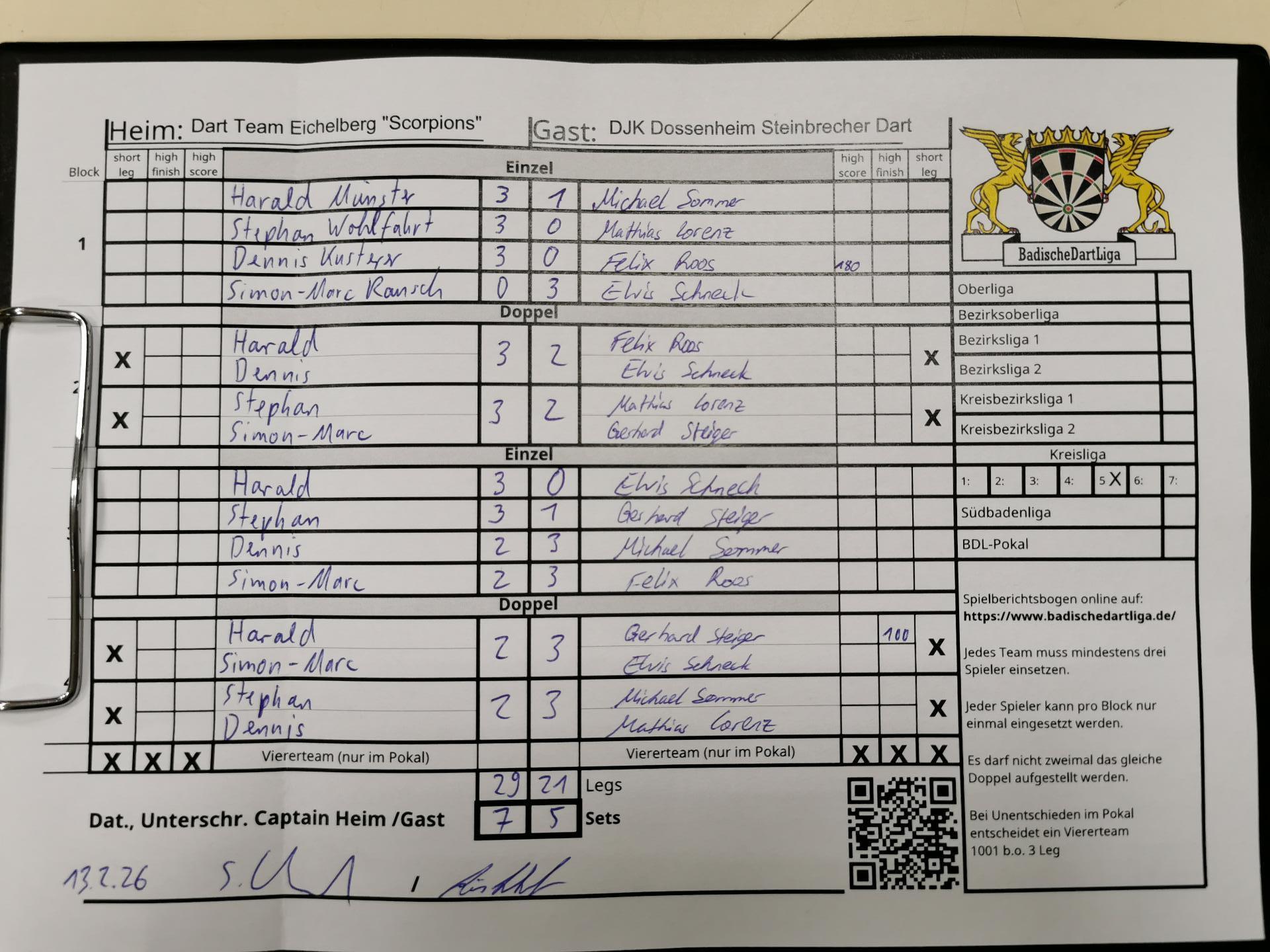 | HEIM: | Dart Team Eichelberg "Scorpions" | GAST: | DJK Dossenheim 1927 e. V. Steinbrecher Dart | |||||