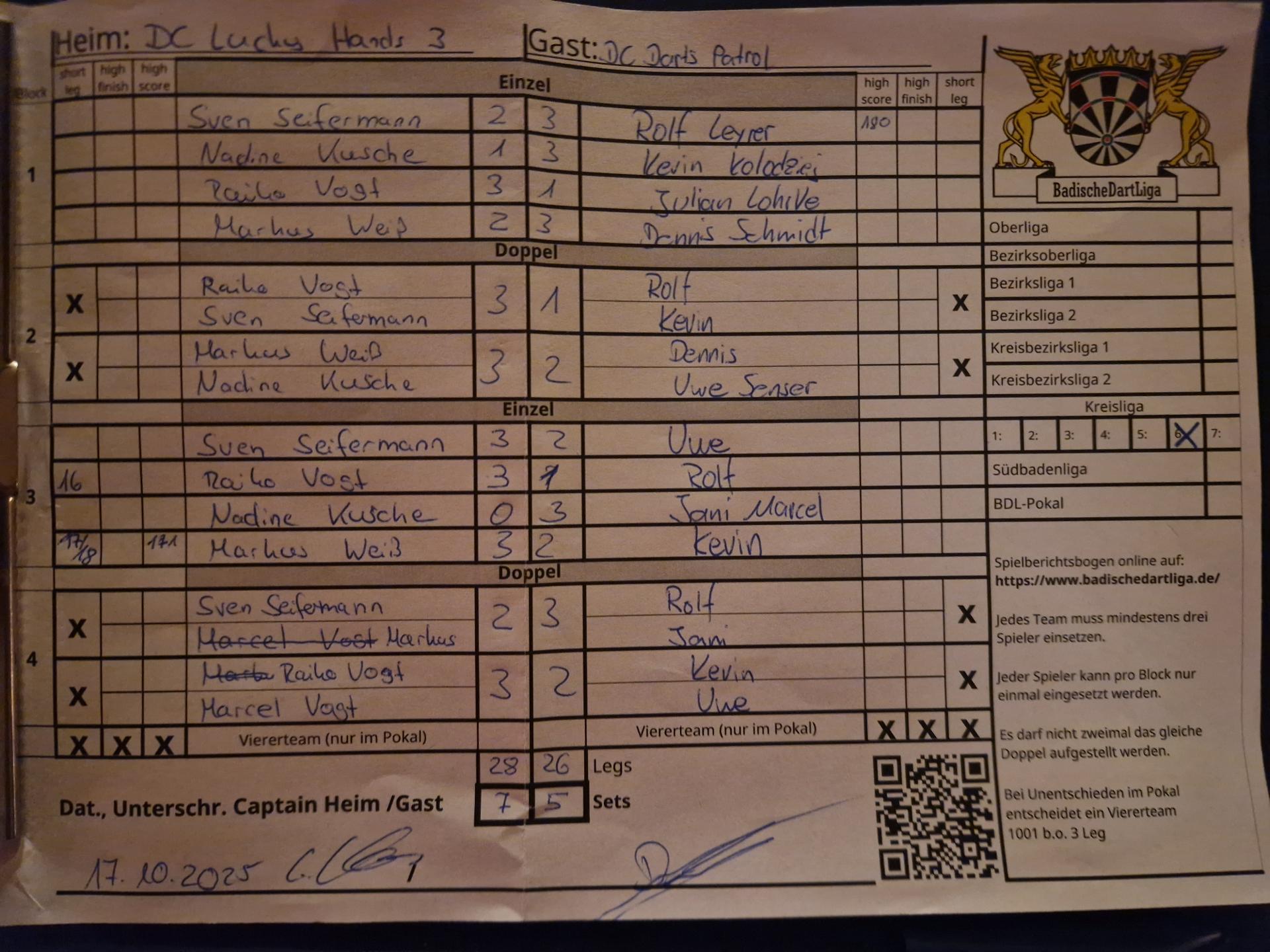 | Ergebnis: | 28 : 26 | - Legs | ||||||