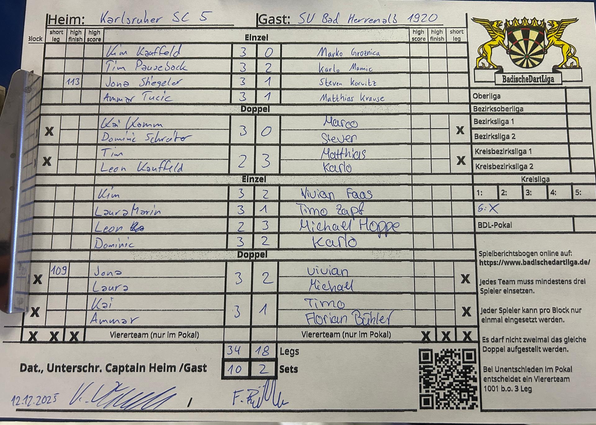 | Ergebnis: | 34 : 18 | - Legs | ||||||