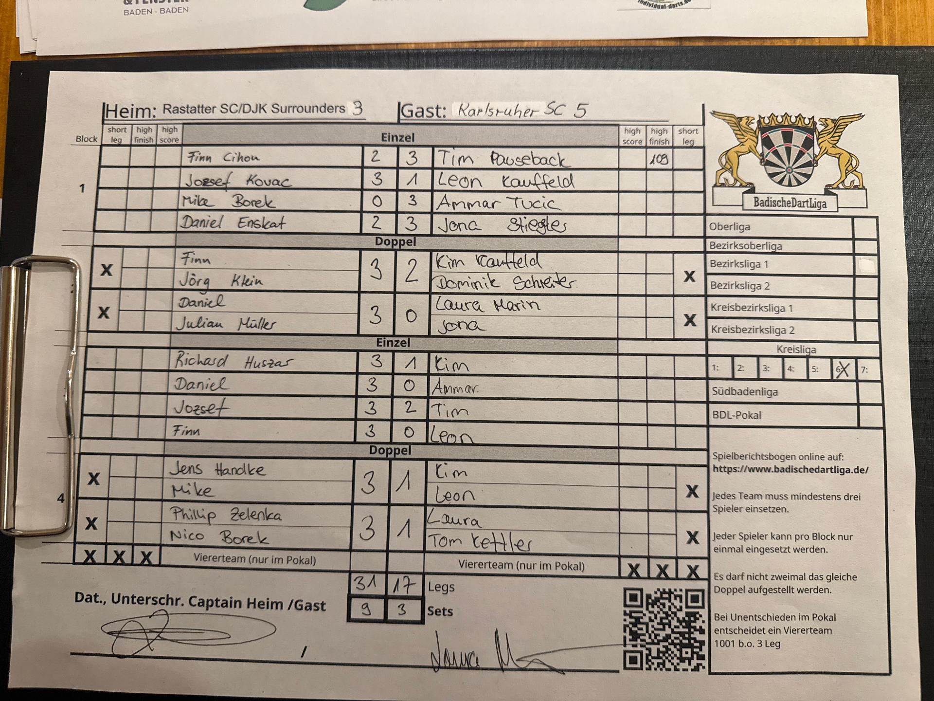 | Ergebnis: | 31 : 16 | - Legs | ||||||