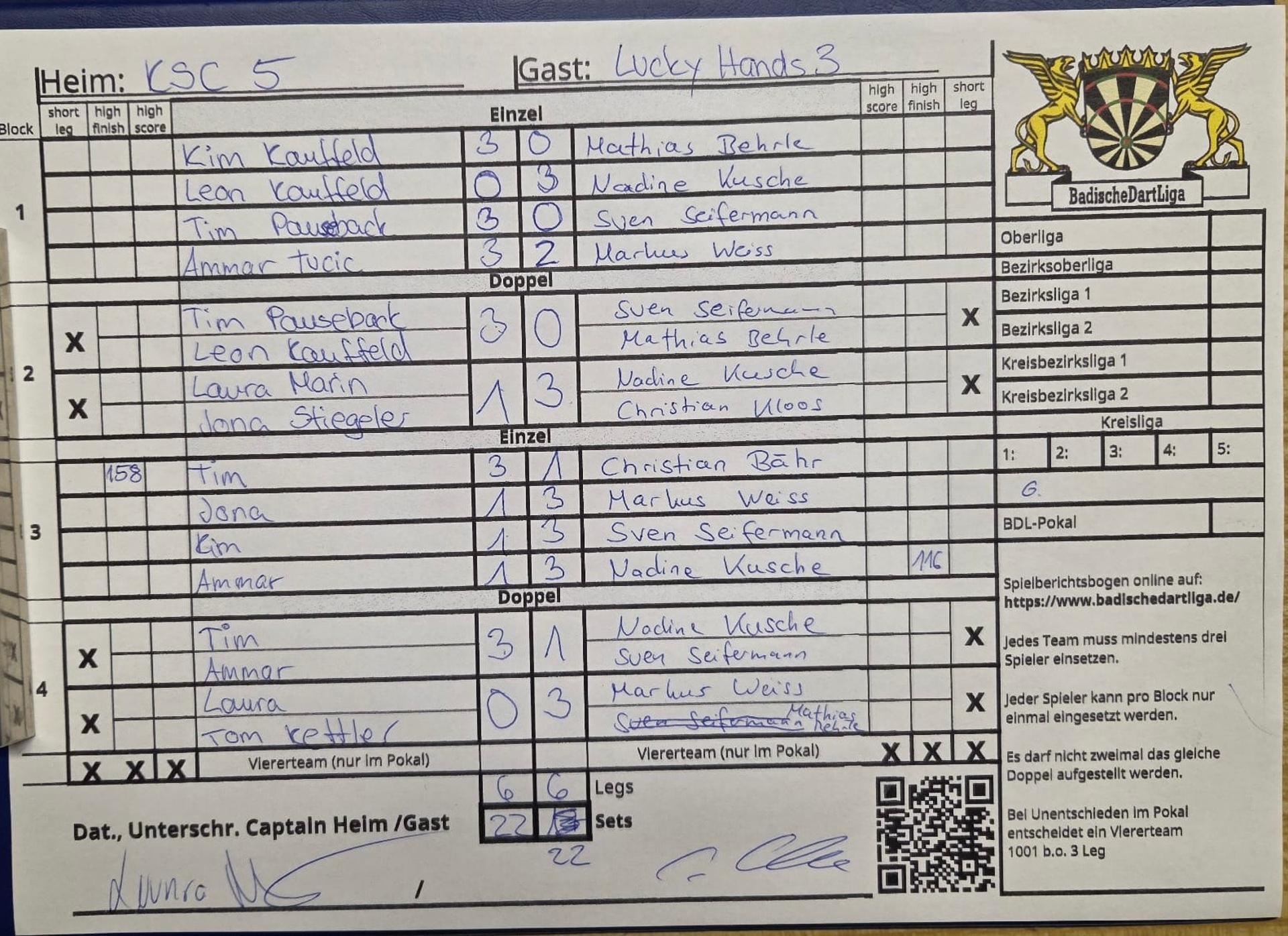 | Ergebnis: | 22 : 22 | - Legs | ||||||