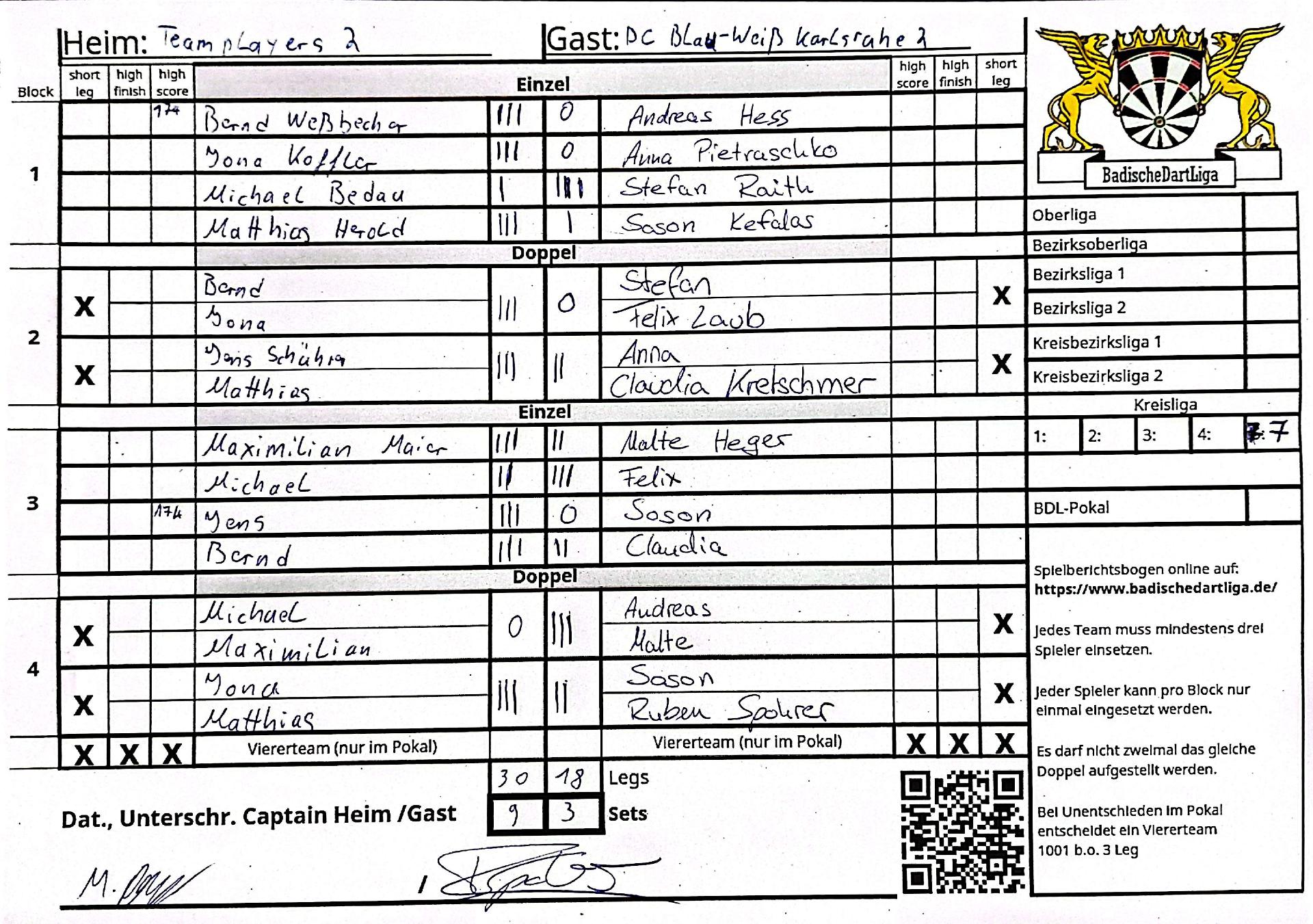 | Ergebnis: | 30 : 18 | - Legs | ||||||