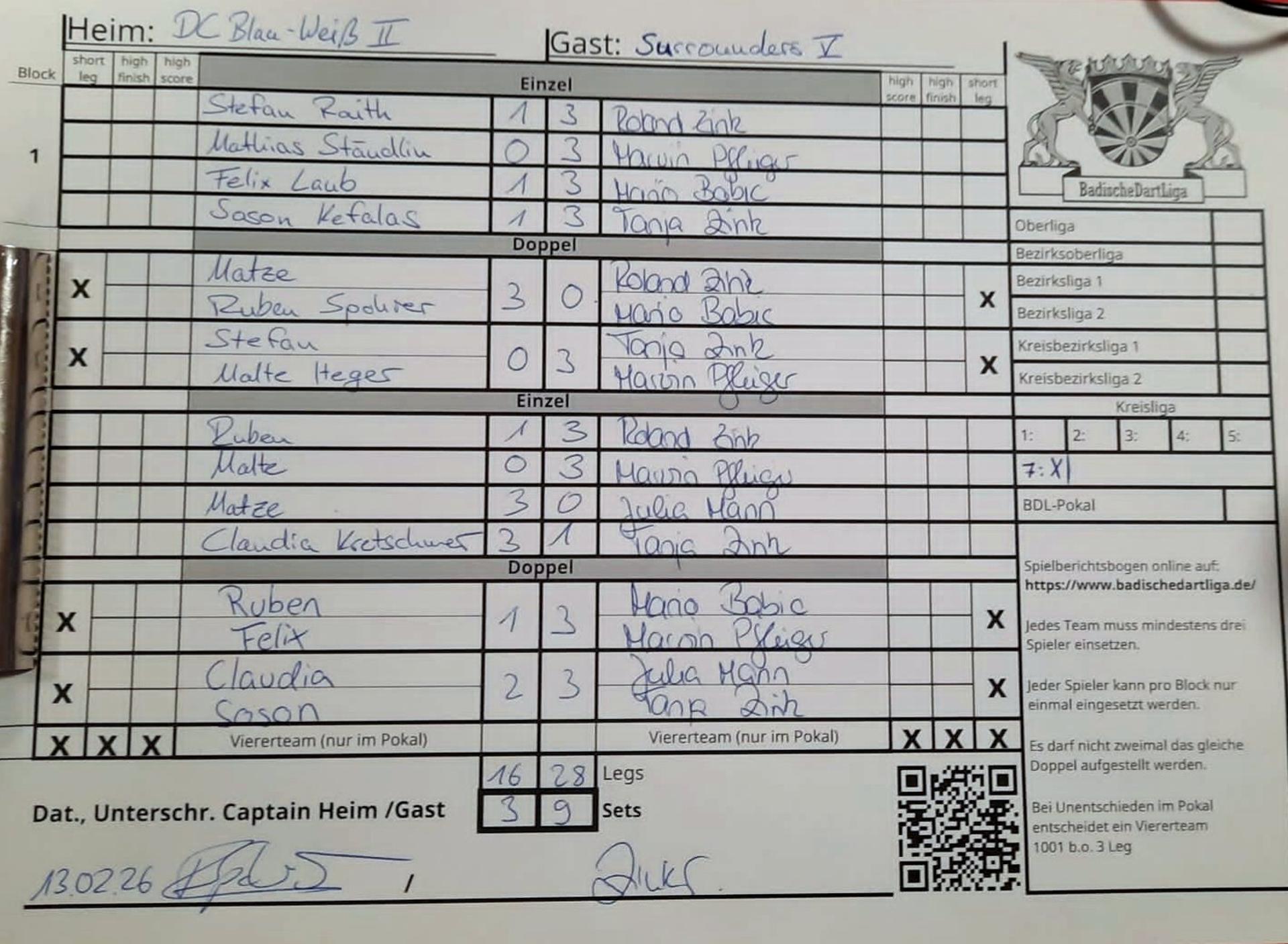 | Ergebnis: | 16 : 28 | - Legs | ||||||