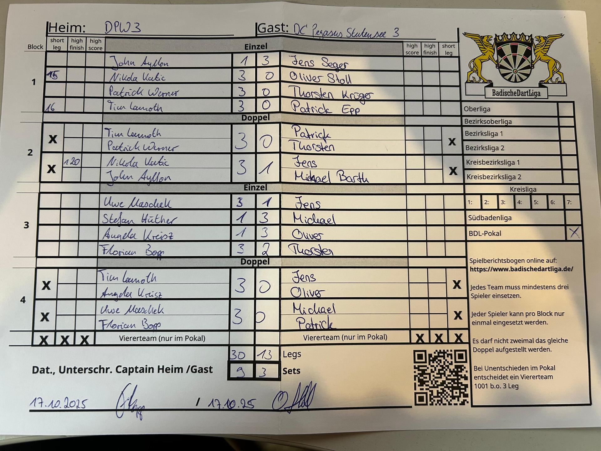 | HEIM: | Darts Pub Walldorf 3 | GAST: | DC Pegasus Stutensee 3 | |||||