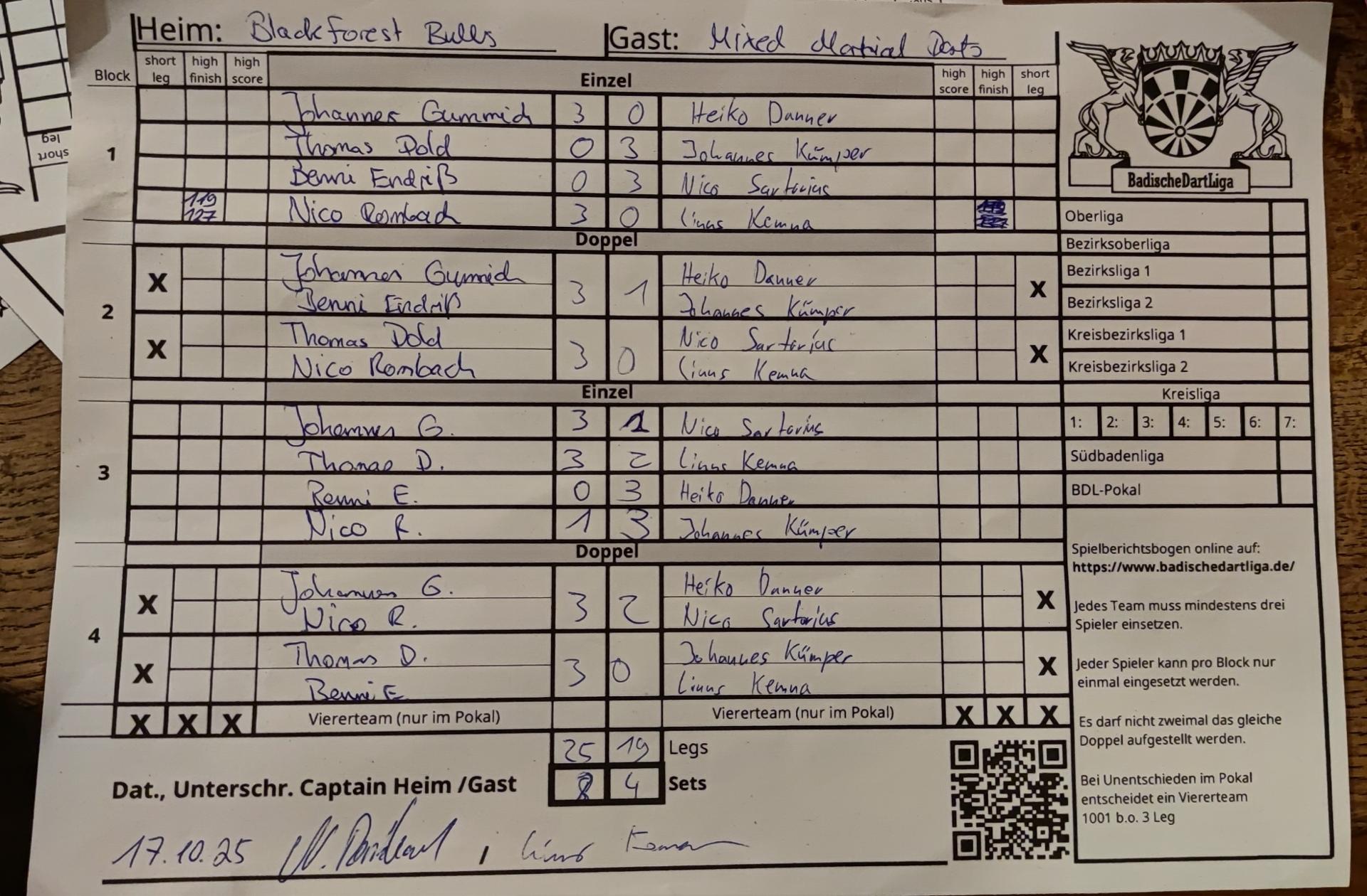 | HEIM: | Blackforest Bulls | GAST: | ESV Freiburg Team 5 Mixed Martial Darts | |||||