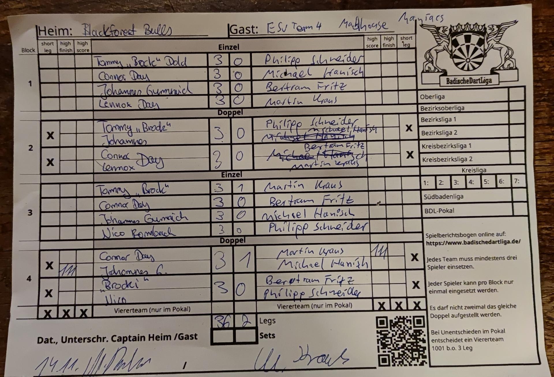 | Ergebnis: | 36 : 2 | - Legs | ||||||