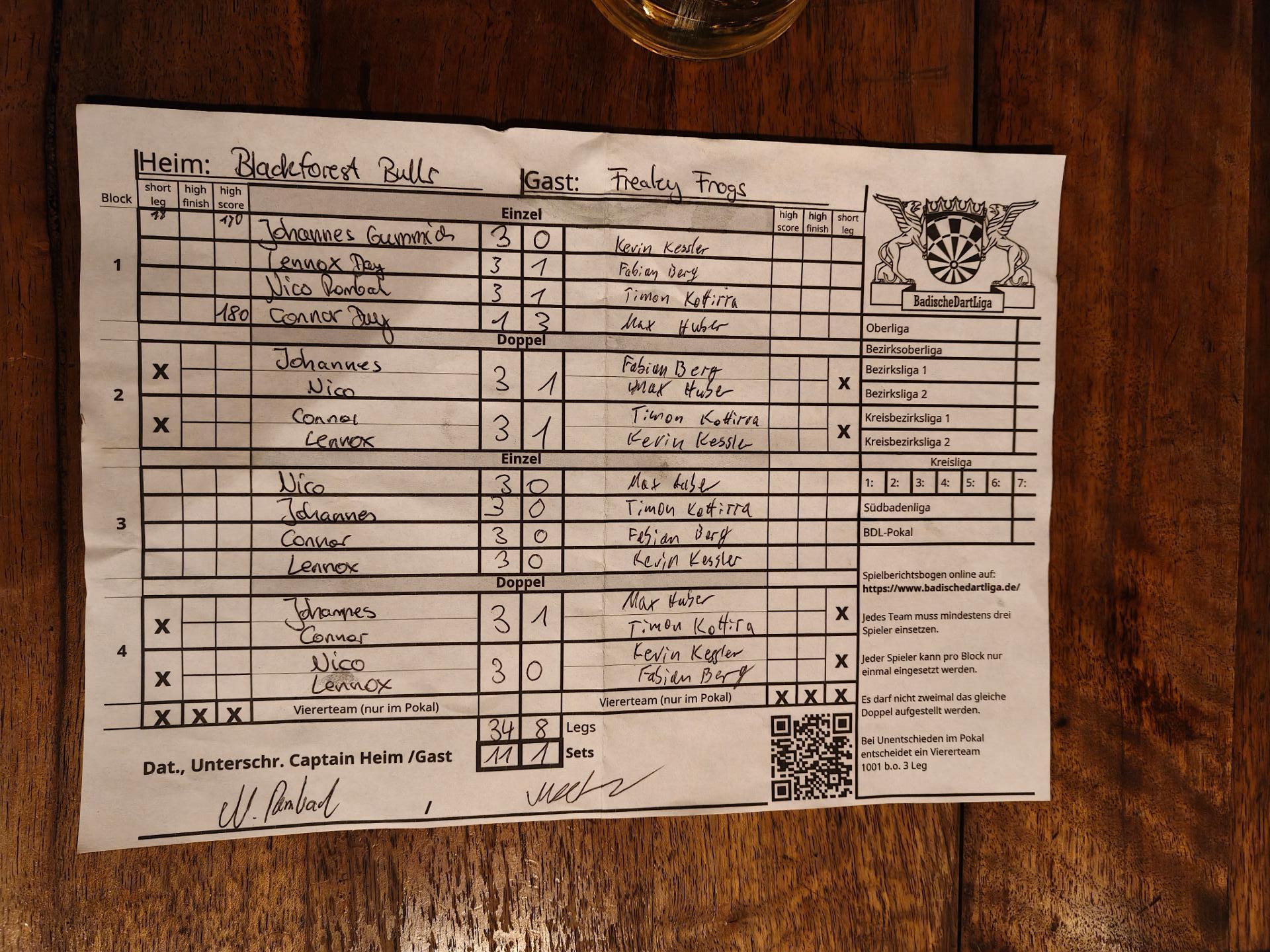 | Ergebnis: | 34 : 8 | - Legs | ||||||