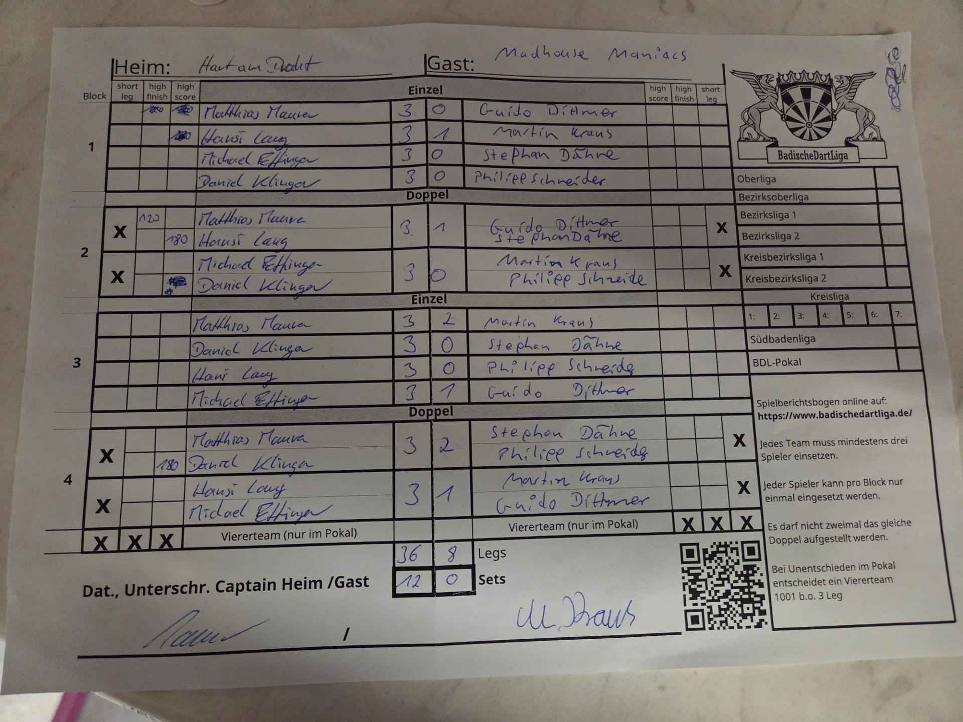 | Ergebnis: | 36 : 8 | - Legs | ||||||