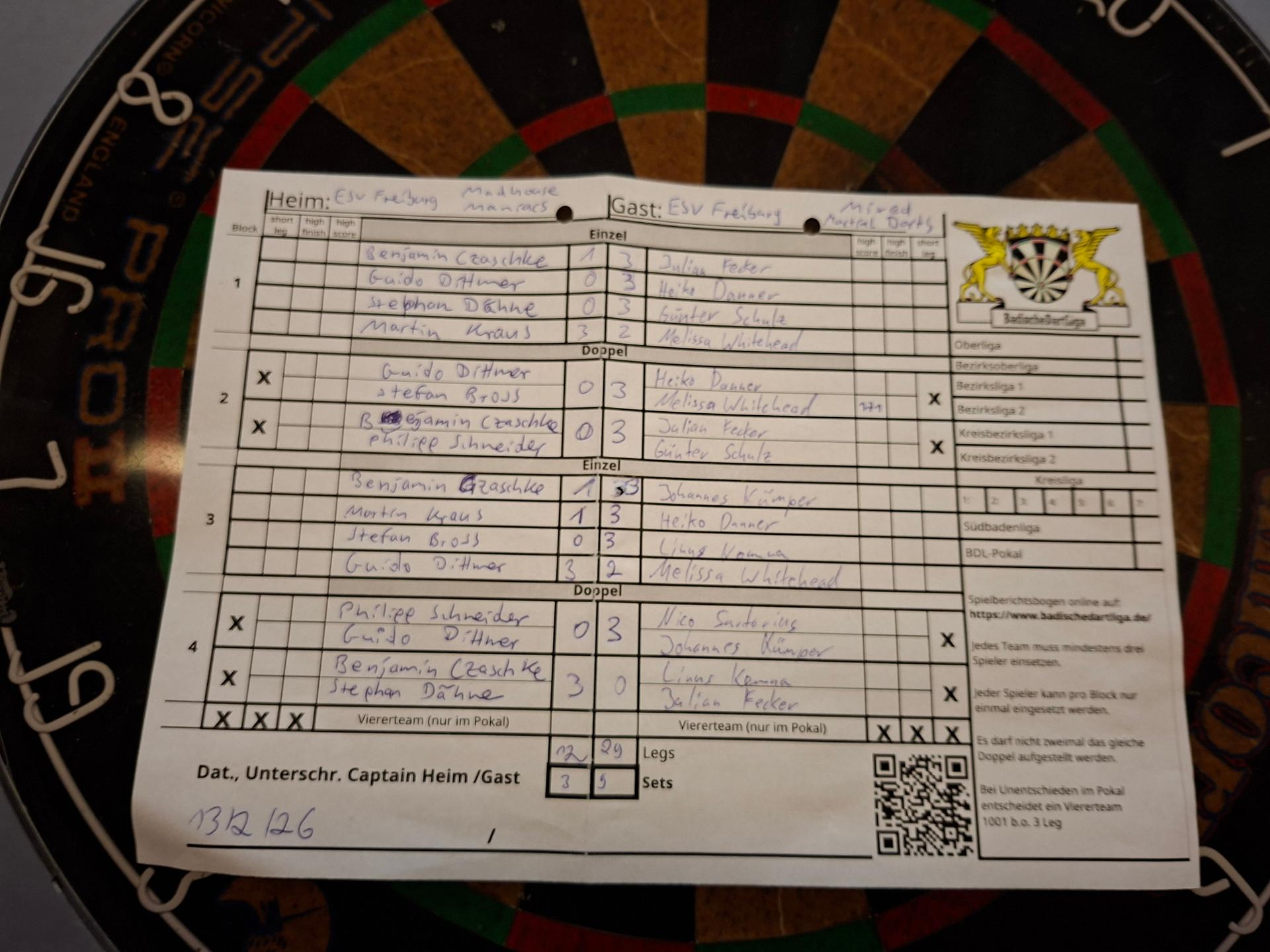 | HEIM: | ESV Freiburg Team 4 Madhouse Maniacs | GAST: | ESV Freiburg Team 5 Mixed Martial Darts | |||||