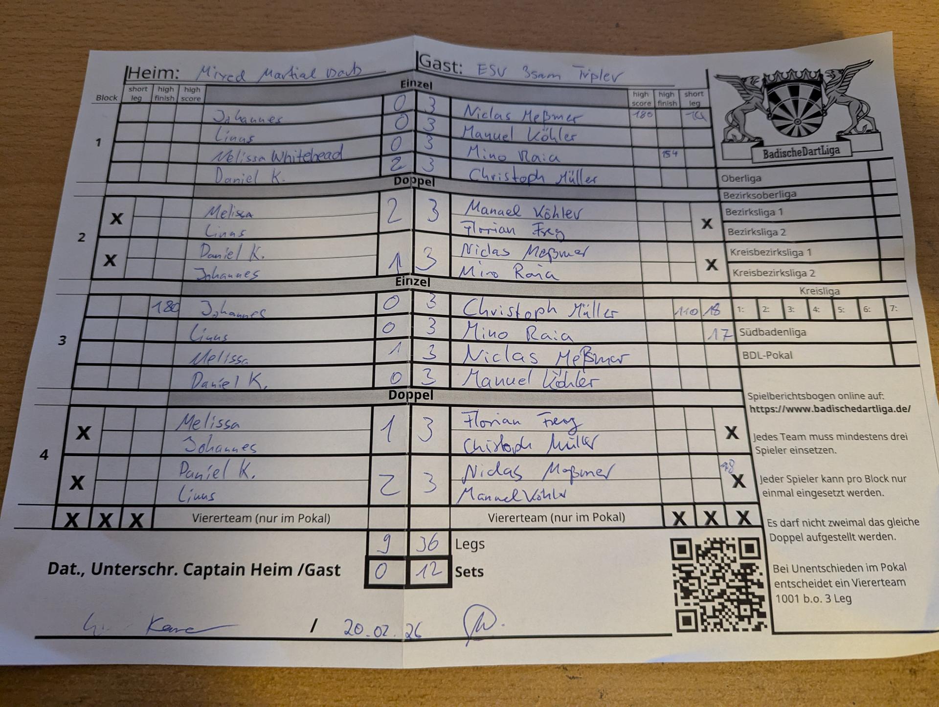 | HEIM: | ESV Freiburg Team 5 Mixed Martial Darts | GAST: | ESV Freiburg Team 1 3samTripler | |||||