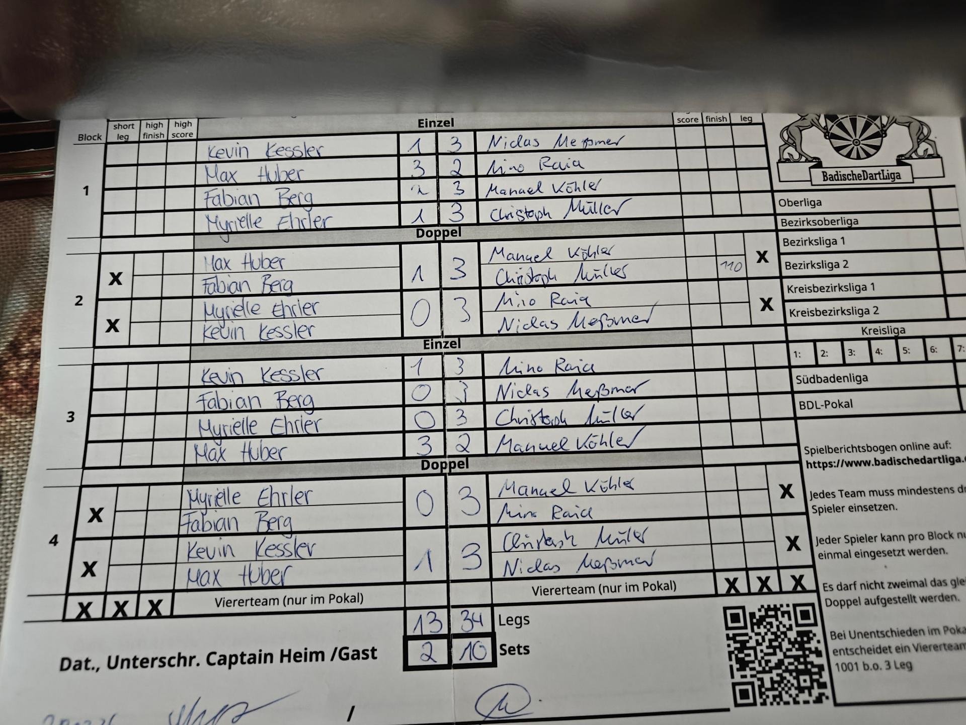 | Ergebnis: | 13 : 34 | - Legs | ||||||
