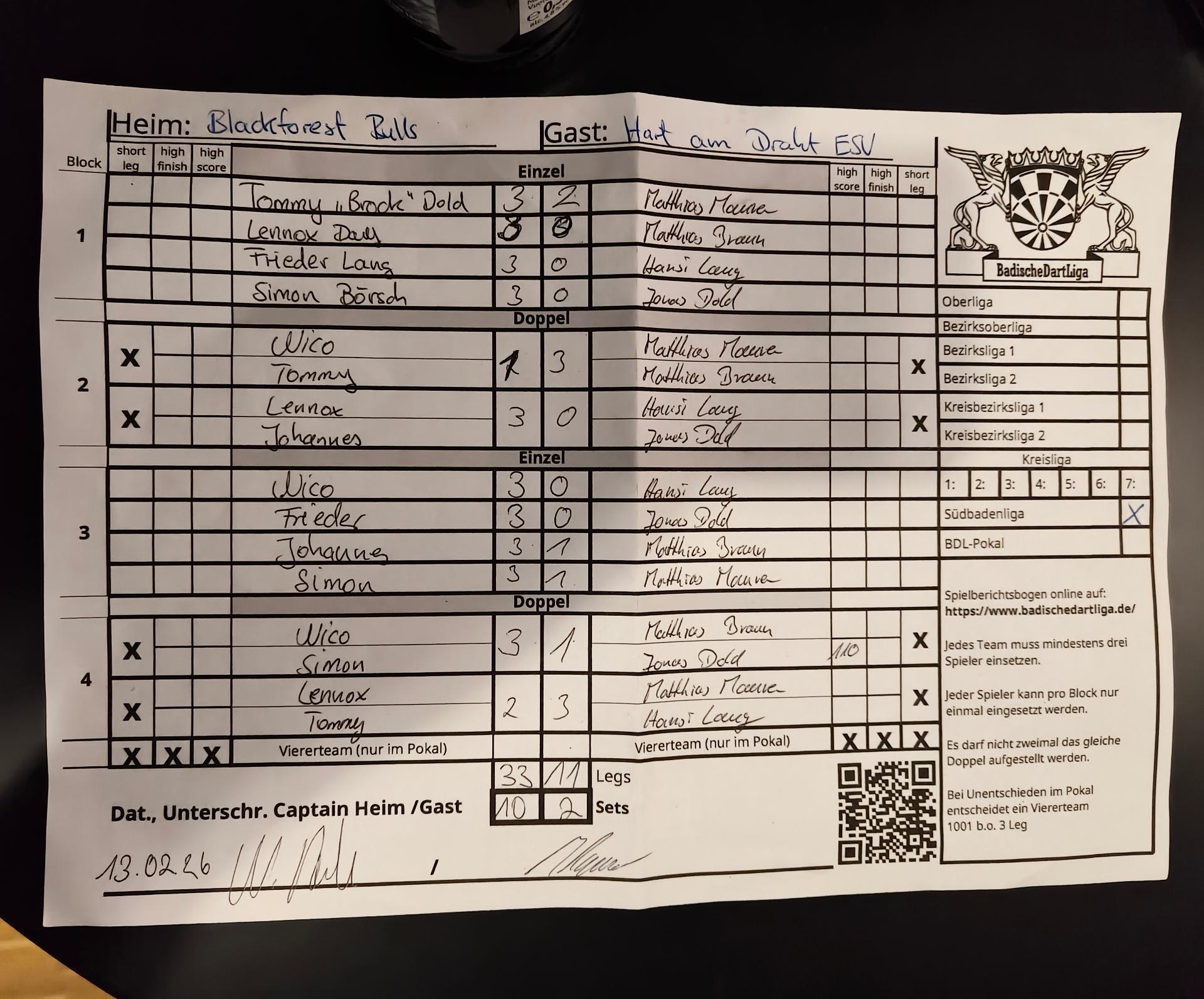 | Ergebnis: | 33 : 11 | - Legs | ||||||