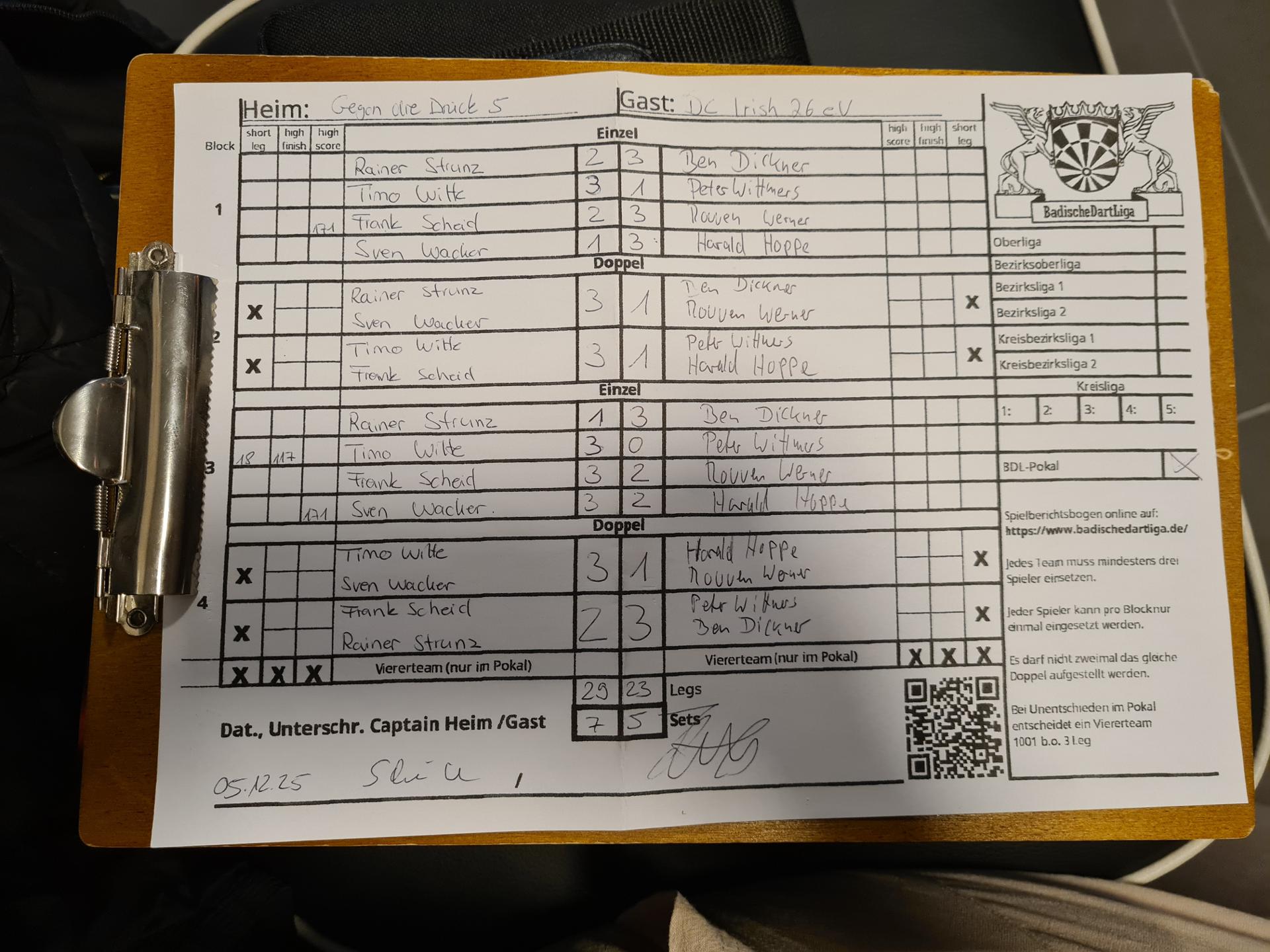| Ergebnis: | 29 : 23 | - Legs | ||||||