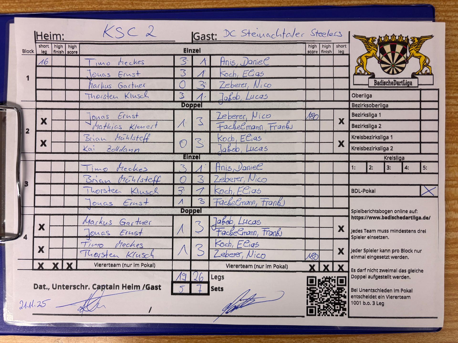 | Ergebnis: | 19 : 26 | - Legs | ||||||