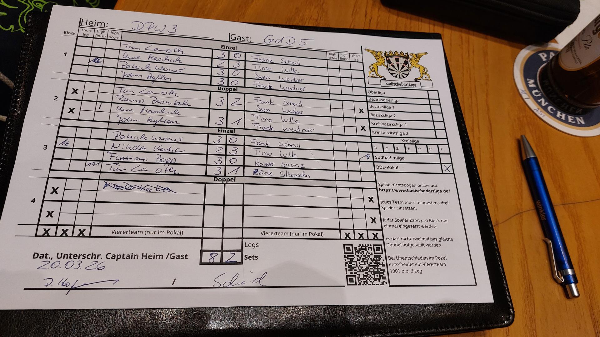 | HEIM: | Darts Pub Walldorf 3 | GAST: | DC Gegen die Drück Sandhausen 5 | |||||