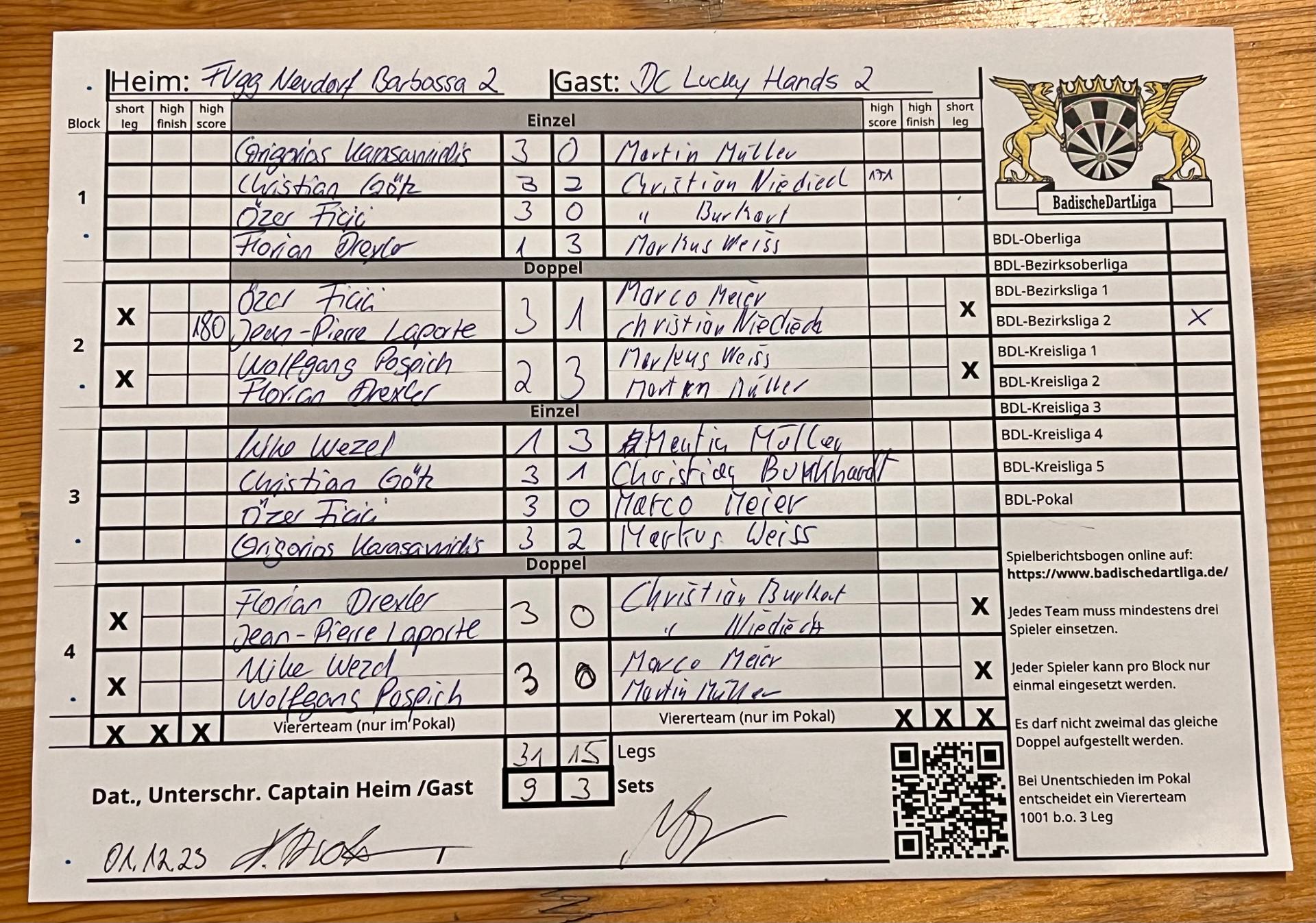 | Ergebnis: | 31 : 15 | - Legs | ||||||